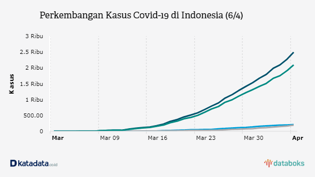 Berdasarkan data Senin (6/4), terdapat 218 tambahan kasus baru Covid-19, sehingga total mencapai 2.491 kasus. Pasien yang masih membutuhkan perawatan sebanyak 2.090 jiwa.
